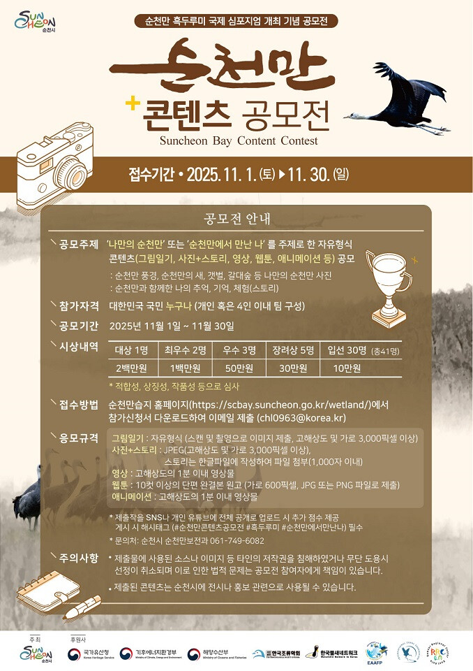 공모 주제는 ‘나만의 순천만’ 또는 ‘순천만에서 만난 나’로, 순천만의 풍경, 흑두루미, 갯벌, 갈대밭 등 직접 촬영한 사진과 일기체 스토리, 또는 웹툰·애니메이션 등 자유 형식의 창작물을 제출할 수 있다.