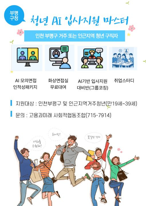 대상은 인천 지역 청년(만 19~39세ㆍ부평 거주자 우선 선발) 거주자 또는 부평구 소재 기업에 취업을 희망하는 청년이다. 모집 인원은 인공지능 입사지원 프로그램 100명과 입사지원 대비반 20명 등이다.