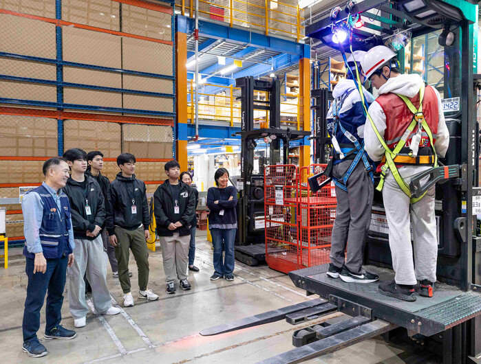 | ▲ 평촌경영고등학교 3학년 학생들이 쿠팡 안성5센터에서 오더피커(Order Picker)를 체험하고 있다. 오더피커는 높은 선반 위의 물건을 손쉽게 운반할 수 있는 장비다. (사진=쿠팡 제공) |