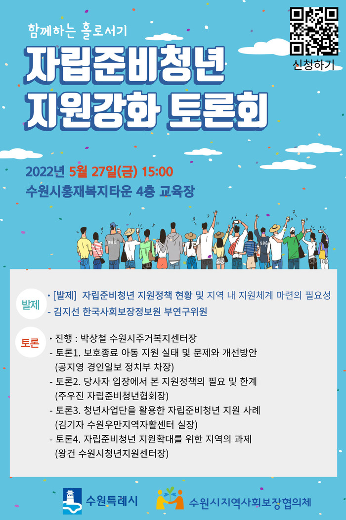 [수원=임종인 기자] 경기 수원시가 오는 27일 오후 3시 수원시홍재복지타운 4층 교육장에서 ‘자립준비청년 지원강화 토론회’를 개최한다.