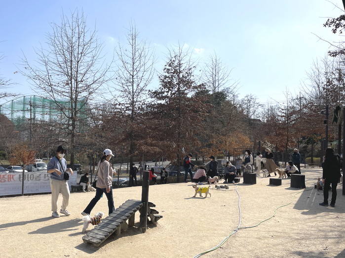 | ▲ 주민들이 반려견과 함께 초안산 근린공원 내 조성된 반려견놀이터를 즐기고 있는 모습. (사진제공=도봉구청) |