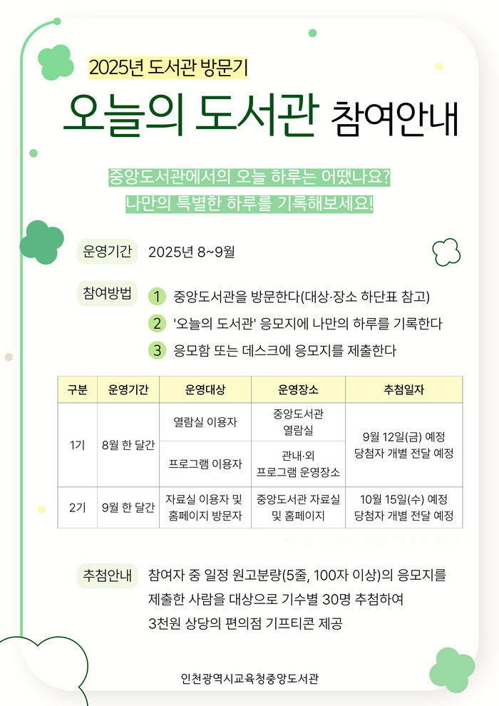[인천=문찬식 기자] 인천광역시교육청중앙도서관(관장 곽미혜)은 시민들이 도서관 이용 경험과 추억을 글로 표현하고 공유하는 ‘오늘의 도서관’ 프로그램을 8월부터 9월까지 운영한다고 밝혔다.