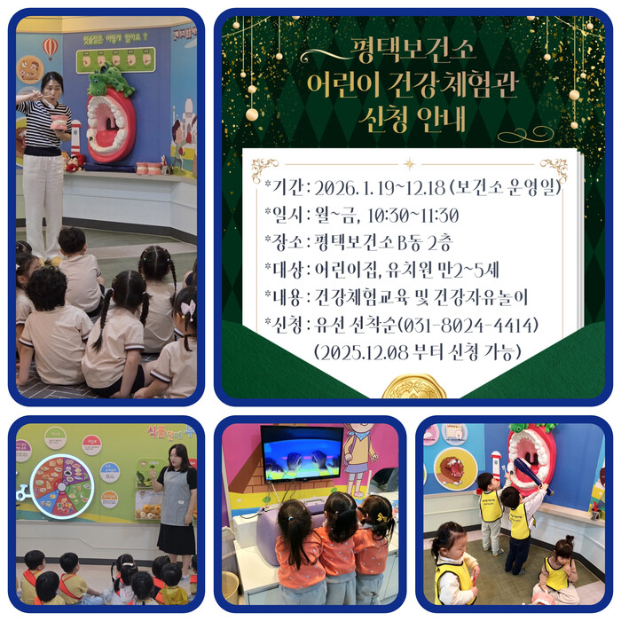 평택보건소 어린이 건강체험관은 지난 2016년부터 운영을 시작했으며, 어린이 눈높이에 맞춘 다양한 시각 자료와 교구를 활용해 건강 지식을 놀이처럼 쉽고 재미있게 배울 수 있도록 구성된 통합 체험형 교육 공간이다.