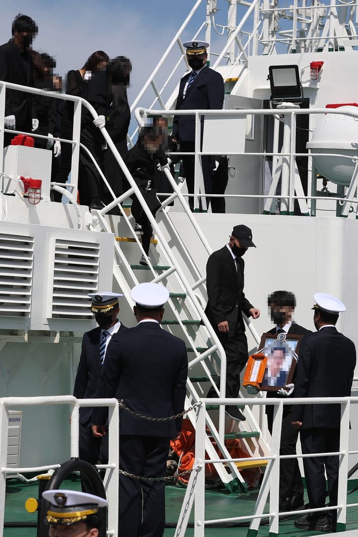 서해상에서 북한군에 피살된 고(故) 이대준 해양수산부 주무관의 추모 노제가 22일 낮 전남 목포시 서해어업관리단 전용 부두에서 엄수돼 고인의 동료들이 어업지도선 무궁화 10호에 도착한 장례 행렬을 맞이하고 있다.