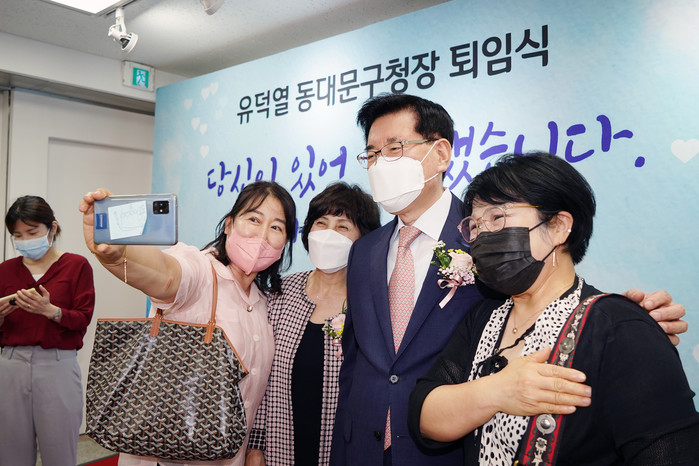민선 5·6·7기를 역임한 유덕열 서울 동대문구청장이 28일 퇴임식에 참석해 구민과 직원들에게 구청장으로서의 마지막 인사를 전했다. 퇴임식은 축사, 공로패 증정, 퇴임사 등의 순서로 진행됐다. 사진은 이날 유 구청장(오른쪽 두 번째)이 구민들과 기념촬영을 하고 있는 모습. (사진제공=동대문구청)