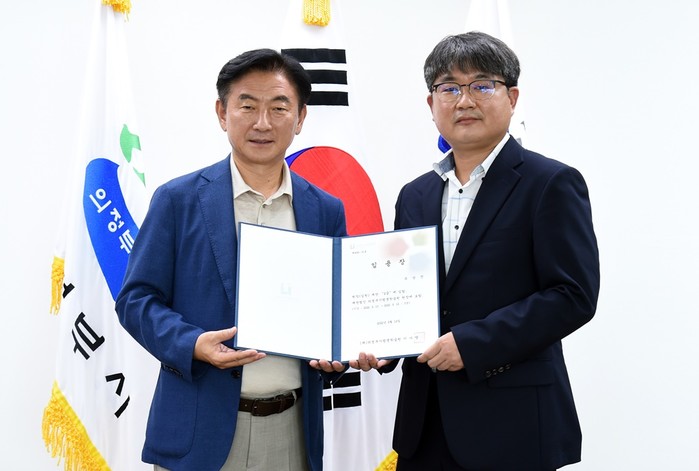 경기 의정부시 재단법인 의정부시평생학습원이 19일 공개모집을 통해 신임 원장에 유상진 원장을 임명했다. 임기는 오는 2025년 9월18일까지 3년이다. 사진은 김동근 시장(왼쪽)이 유 신임 원장에게 임용장을 전달하는 모습. (사진제공=의정부시청)