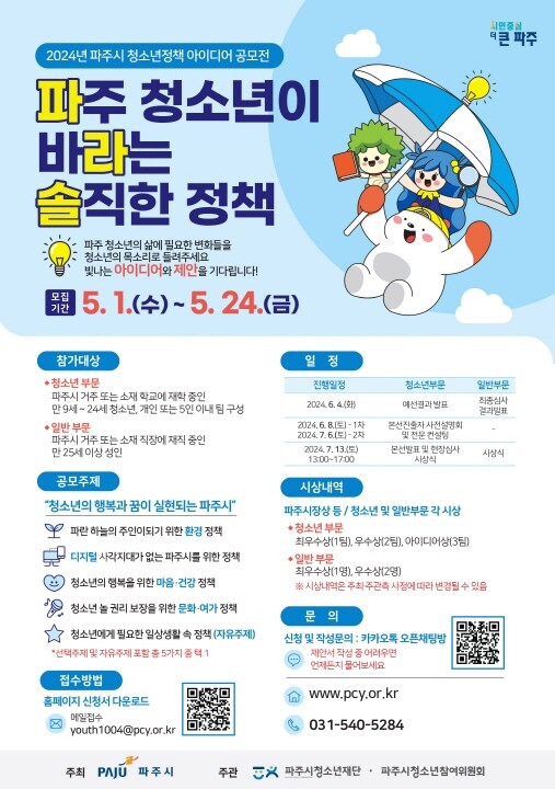 [파주=조영환 기자] 경기 파주시와 파주시청소년재단 및 파주시청소년참여위원회는 청소년 및 일반시민의 정책 의견을 수렴하기 위한 ‘2024년 파주시 청소년정책 아이디어 공모전’ 참가자를 오는 24일까지 모집한다.