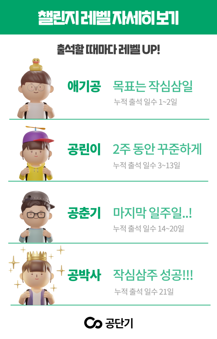 [시민일보 = 여영준 기자] 에스티유니타스의 공무원 시험 전문 브랜드 ‘공단기’는 수강생의 공부 습관을 잡아주기 위한 챌린지 형식의 이벤트 ‘작심삼주 챌린지’를 19일 오전 0시부터 진행한다고 밝혔다.