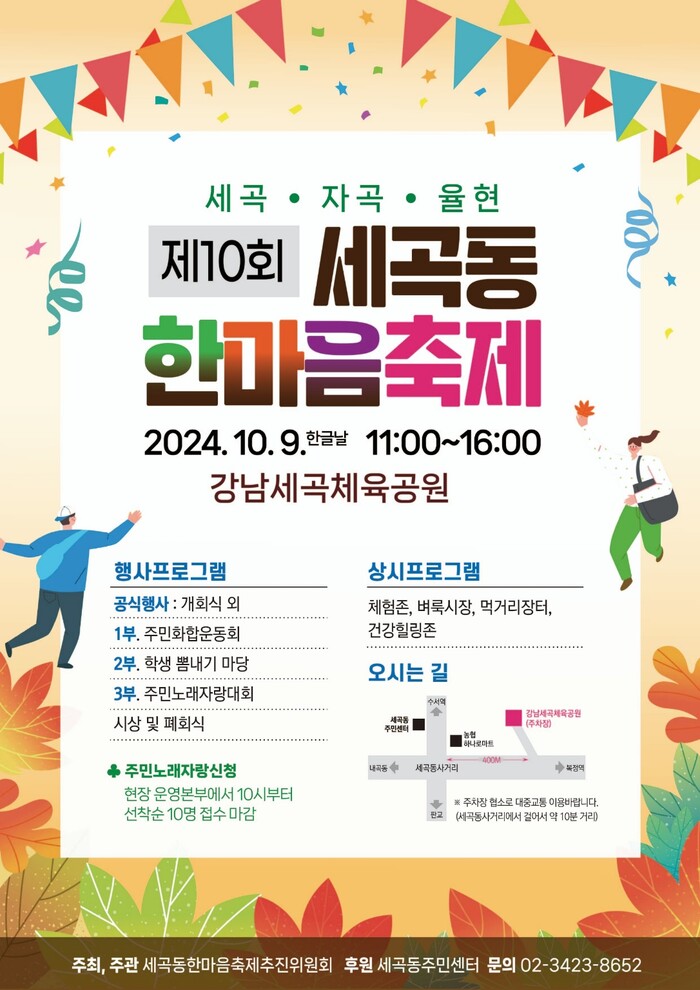 [시민일보 = 이대우 기자] 꿈이 모이는 도시, 미래를 그리는 강남구(구청장 조성명) 세곡동이 오는 9일 강남세곡체육공원(헌릉로 679)에서 ‘제10회 세곡동 한마음축제’를 개최한다.