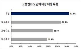 코로나19로 인한 매출감소나 생산위축 등 고용 변화 요인에도 불구하고 조사기업의 77.7%가 대다수 기업은 별다른 조치 없이 고용을 유지해 온 것으로 확인되었다. 관련조치를 취한기업은 22.3%에 불과하였으며, 대응 유형별로는 휴업과 유급휴직이 각각 31.3%, 26.9%로 가장 높은 비중을 차지했으며, 그 외 조업축소 22.4%, 무급휴직 19.4%의 순이었다.