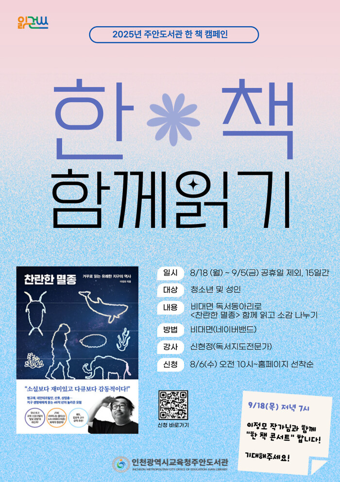 [인천=문찬식 기자] 인천광역시교육청주안도서관(관장 최문정)은 2025년 ‘한 도서관 한 책’ 캠페인의 일환으로 ‘SNS 한 책 함께 읽기’ 프로그램을 오는 8월 18일(월)부터 9월 5일(금)까지 운영한다고 밝혔다.