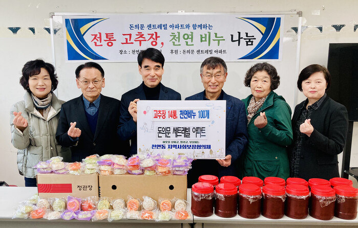 최근 이 아파트 ‘에너지지킴이, 입주자대표회의, 부녀회’는 전통 고추장 14통과 수제 천연비누 100개를 기부했으며 천연동주민센터는 이를 관내 나라사랑채 입주자와 저소득층 주민 등에게 전달하고 돌봄활동을 함께 펼쳤다.