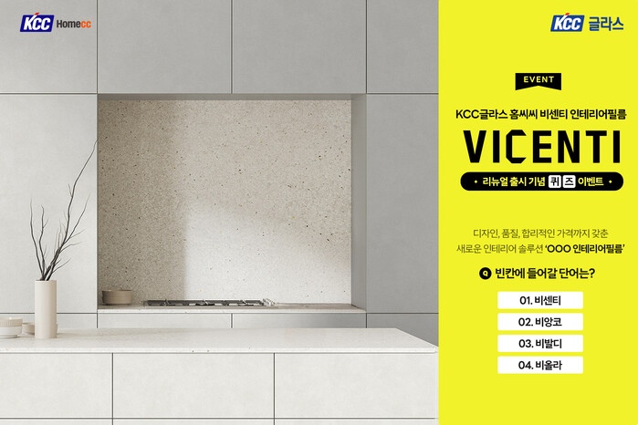 [시민일보 = 박소진 기자] KCC글라스(케이씨씨글라스, 대표 정몽익)는 인테리어 전문 브랜드 ‘홈씨씨’가 인테리어 표면 마감재인 ‘비센티(VICENTI) 인테리어필름’의 리뉴얼 출시를 기념해 SNS 퀴즈 이벤트를 진행한다고 27일 밝혔다.