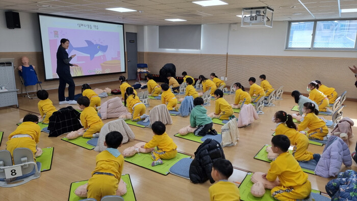 5~7세 어린이를 대상으로 진행한 이번 교육은 심정지 환자 발생 후 골든 타임(4분) 안에 시행하는 심폐소생술을 체험해보는 기회를 마련하고자 추진됐으며, 지역내 유치원·어린이집 12개 기관에서 260명이 참여했다.