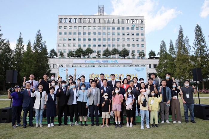 경기 부천시는 최근 청년들의 다양한 활동과 목소리 발산장으로 ‘2022년 부천 청년주간’ 행사를 부천시청 잔디광장에서 성황리에 개최했다. 사진은 행사에 참석한 조용익 시장(앞줄 가운데)과 참석자들이 기념촬영을 하는 모습. (사진제공=부천시청)
