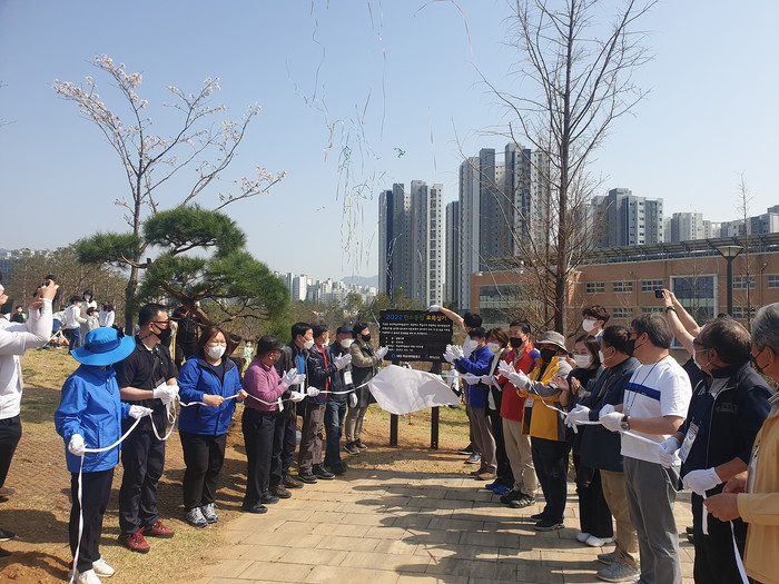 MG하남새마을금고는 제77회 식목일을 맞이해 최근 경기 하남시 미사강변중학교 뒤편 미사공원에서 '묘목심기 가족 행사'를 개최해 왕벚나무 500주와 튤립 2500송이를 식재했다. 회원들은 직접 나무를 심고 본인이 심은 나무에 수목 표찰을 만드는 등 행사에 의미를 더했다. 사진은 이날 참가자들이 제막식을 진행하는 모습. (사진제공=하남시청)
