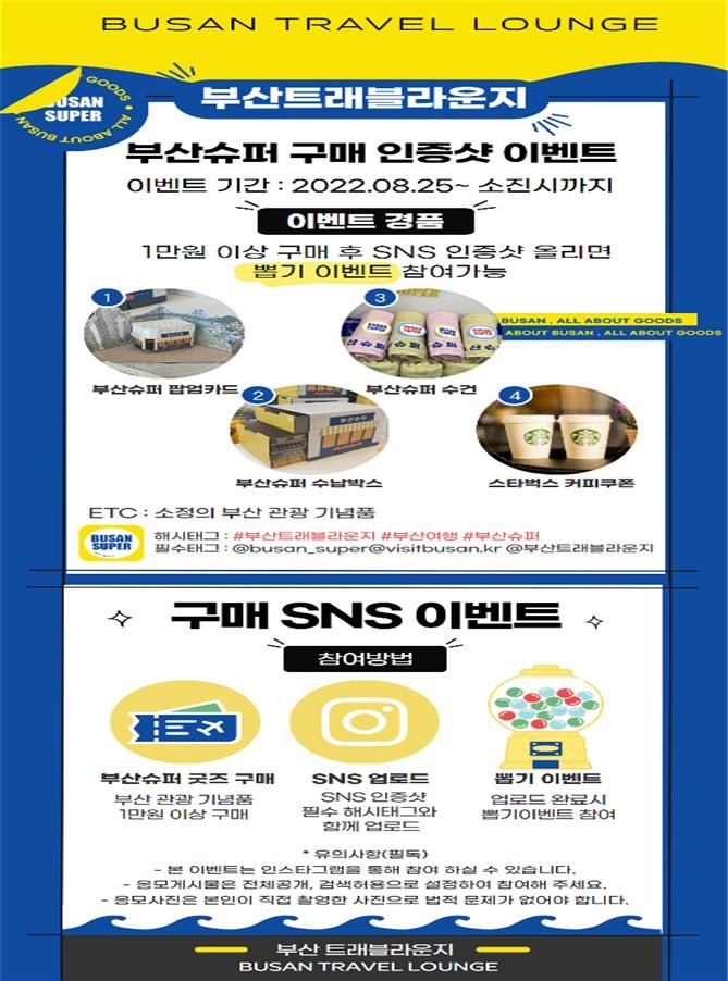 이와 함께, 시는 부산관광공사와 오는 10월 30일까지 팝업스토어 <부산슈퍼>를 부산트래블라운지 1·2층에서 운영한다. <부산슈퍼>에서는 관광스타트업의 판로를 지원하고 부산 여행객들에게 이색적인 기념품을 선보일 예정이다.