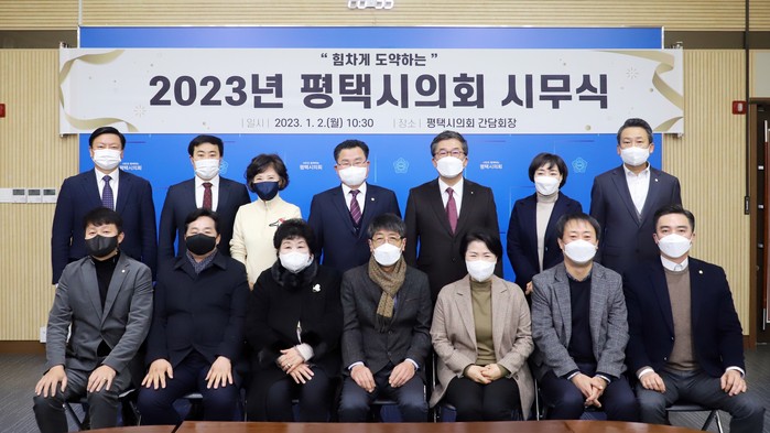 [평택=오왕석 기자] 평택시의회(의장 유승영)는 2일 시의회 간담회장에서 의원 및 의회사무국 직원 등 50여 명이 참석한 가운데 2023년 시무식을 가졌다.