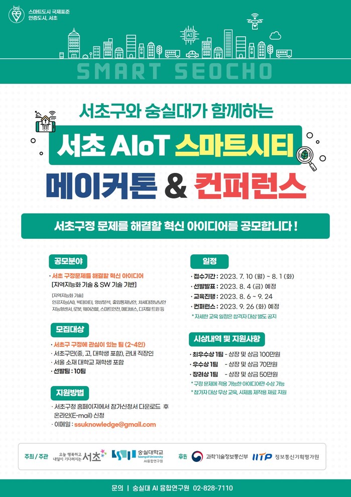 [시민일보 = 이대우 기자] 서초구(구청장 전성수)가 오는 8월1일까지 ‘서초 AIoT 스마트시티 메이커톤&컨퍼런스‘에 참여할 10팀을 모집한다.