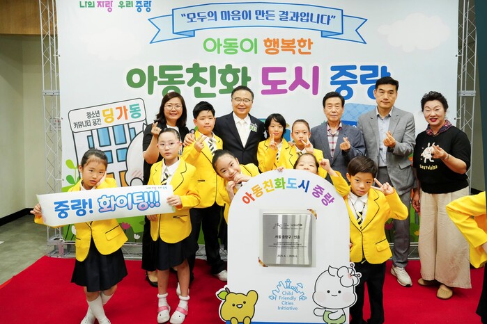 서울 중랑구가 2일, 중랑구청 지하 대강당에서 유니세프 아동친화도시 인증 기념식을 개최했다. 이번 행사는 중랑구가 지난 6월5일 유니세프 한국위원회로부터 공식 인증을 받은 것을 축하하고, 아동의 권리가 일상 속에서 실현되는 도시를 향한 비전을 공유하기 위해 마련됐다. 사진은 류경기 구청장(가운데)이 참석자들과 기념촬영을 하고 있는 모습. (사진=중랑구청 제공)
