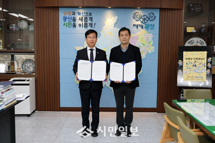 | ▲ 박뱡규 광주광역시 광산구청장(왼 쪽)이 11일 구청장실에서 ㈜미래에코에너지와 ‘커피찌꺼기 재자원화’ 업무협약을 체결한 후 기념촬영을 히고 있다; / 강진군 제공 |