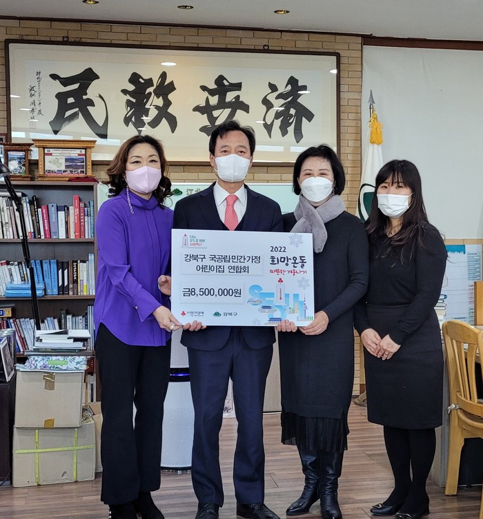 [시민일보 = 홍덕표 기자] 서울 강북구(구청장 박겸수)는 최근 국공립어린이집·민간어린이집·가정어린이집 연합회와 함께 따뜻한 겨울나기 성금 전달식을 개최했다고 20일 밝혔다.