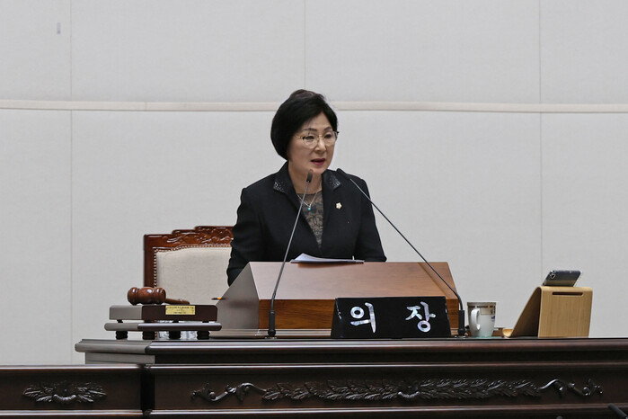 | ▲ 제285회 제1차 정례회에서 남연희 의장의 모습. (사진=성동구의회 제공) |
