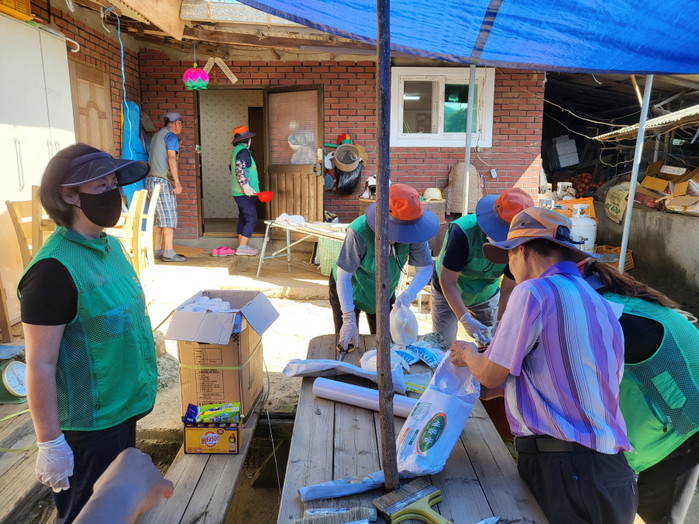 경기 양평군 강상면새마을회는 최근 주거환경이 취약한 저소득층 노인가정을 방문해 장마철을 대비해 오래된 노후 주택의 낡은 벽지와 장판을 새것으로 교체하는 등 집수리 봉사활동을 펼쳤다. 사진은 이날 봉사자들이 집수리 봉사활동을 하고 있는 모습. (사진제공=양평군청)