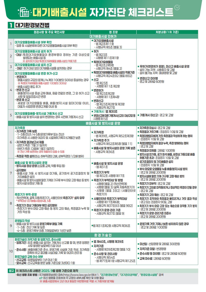 이번에 배포된 점검표는 사업장이 스스로 오염물질 배출시설 및 방지시설 운영 전반을 점검할 수 있도록 구성됐으며, ▲배출시설 허가ㆍ신고 사항 ▲자가측정 이행 여부 ▲방지시설 정상 가동 ▲측정기기 부착ㆍ운영 상태 ▲환경기술인 선임 및 교육 이수 여부 등 12개 주요 항목과 세부 점검 사항이 담겨 있다.