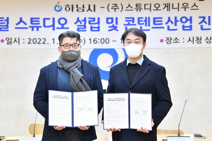 경기 하남시는 12일 (주)스튜디오게니우스와 업무협약을 맺고 하남시 문화산업 생태계 강화를 위해 상호 협력하기로 했다. 협약을 통해 양 기관은 디지털 스튜디오(영화촬영소) 설립 등을 위해 협력하게 된다. 사진은 협약식에서 김상호 시장(오른쪽)과 양우석 대표가 기념촬영을 하는 모습. (사진제공=하남시청)