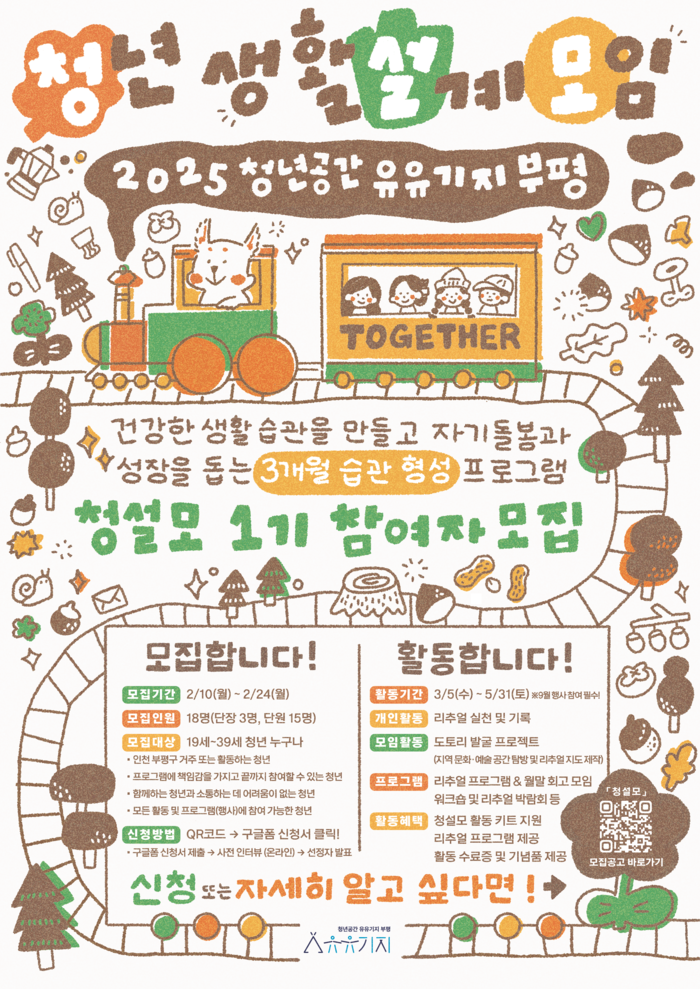 [인천=문찬식 기자] 인천 부평구 ‘청년공간 유유기지 부평’은 오는 24일까지 청년들을 위한 프로그램 ‘청설모’에 참여할 인원을 모집한다고 밝혔다.