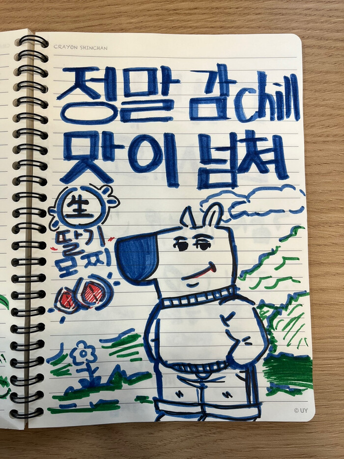 노트에는 생딸기 모찌와 최근 트렌드 밈인 '칠 가이(chill guy)' 캐릭터가 그려져 있었고, 맨 위에는 '정말 감chill맛이 넘쳐'라는 글귀가 적혀 있었다.