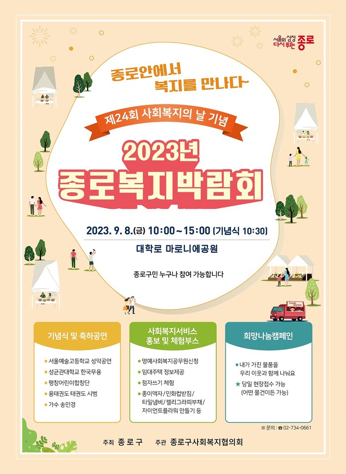 [시민일보 = 이대우 기자] 종로구(구청장 정문헌)에서 오는 8일 오전 10시~오후 3시 마로니에공원(대학로 104)에서 ‘2023년 종로 복지박람회 - 종로 안에서 복지를 만나다’가 개최된다.