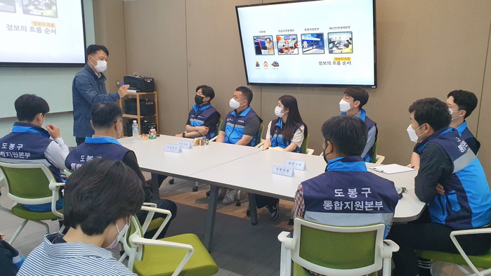 도봉구는 지난 23일 재난현장의 신속한 초기대응 및 수습복구를 위해 쌍문동 아파트 건축공사장 대형화재를 가상해 ‘도봉구 재난현장 통합지원본부’와 ‘도봉소방서 긴급구조통제단’ 합동으로 재난현장 지휘역량 강화훈련을 시행했다. 사진은 합동훈련 사전프리핑을 진행하고 있는 모습. (사진제공=도봉구청)