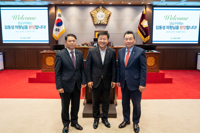 [시민일보 = 이대우 기자] 김형대 서울 강남구의회 의장이 최근 강남구의회 6층 접견실에서 런던 킹스턴구 로버트 김(한국명 김동성) 의원을 접견했다.