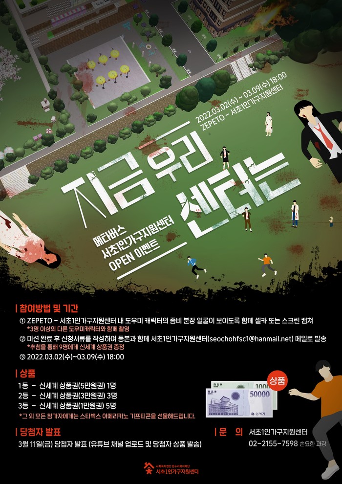 넷플릭스 인기 시리즈 ‘지금 우리 학교는’을 패러디한 ‘지금 우리 센터는’ 이벤트는 가상센터의 다양한 미션 포인트에서 좀비 분장을 한 도우미 캐릭터를 찾아 함께 셀카를 찍어 센터 메일로 발송하면 된다. 추첨을 통해 선물도 증정한다. 자세한 참여방법은 서초1인가구지원센터 홈페이지 및 센터 유튜브 채널 ‘서초싱글톡’을 참고하면 된다.