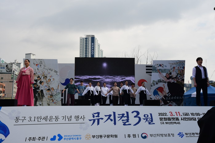 뮤지컬 “3월” 공연은 동구의 대표적인 독립운동가 박재혁 의사의 모친을 주인공으로 영가대전차전복사건, 부산진줄다리기 등 여러 역사적 사건들이 이어지게 연출하였으며,특히 일신여학교 3・1만세운동 공연에서 등장하는 대형태극기로 희망과 광복을 표현하여 이 행사에 의미를 더했다.