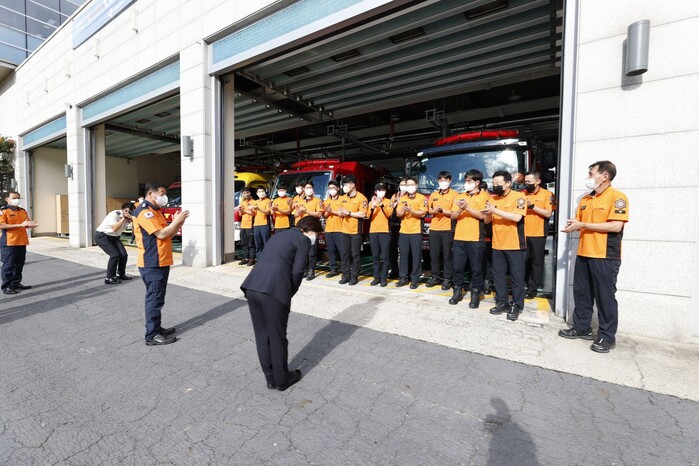 | ▲ 지난해 은평소방서를 찾은 김미경 구청장이 직원들을 만나 감사 인사를 하고 있다. (사진=은평구청 제공) |