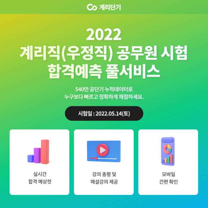 [시민일보 = 여영준 기자] 에스티유니타스의 계리직 공무원 시험 전문 브랜드 ‘계리단기’는 오는 14일 시행되는 ‘우정 9급 우정서기보(계리) 공개경쟁 채용시험’ 직후 합격 가능 여부를 가늠해볼 수 있는 ‘2022 계리직(우정직) 공무원 시험 합격예측 풀서비스’를 제공한다고 2일 밝혔다.
