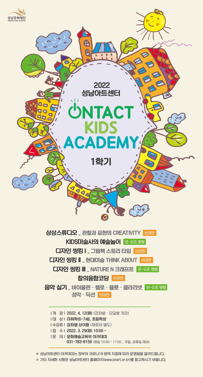 오는 4월 12일부터 7월까지 이어지는 2022년 1학기 정규강좌는 창의 STEAM(융합)미술, 코딩, 음악 강좌 등 8개 강좌를 연령별, 영역별, 유형별로 설계해 진행한다. 특히 이번 학기부터는 일부 강좌를 온·오프라인 병행해 운영하고, 체험과 실기 중심의 예술 원격수업을 확대해 수강생들과의 소통을 강화했다.