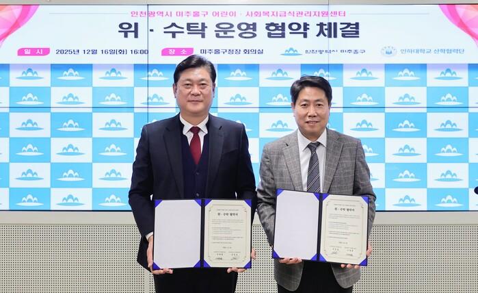 [인천=문찬식 기자] 인천 미추홀구(구청장 이영훈)는 지난 16일 구청장실에서 인하대학교 산학협력단(단장 김동욱)과 미추홀구 어린이·사회복지급식관리지원센터(이하 센터) 위수탁 운영 협약을 체결했다.