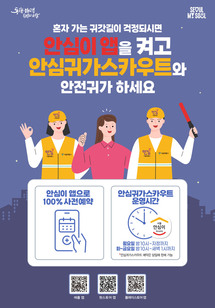 안심귀가 동행 서비스 이용을 원하는 경우 ‘서울시 안심이’ 앱을 통해 이용 시간 30분 전까지 예약하면 된다.
