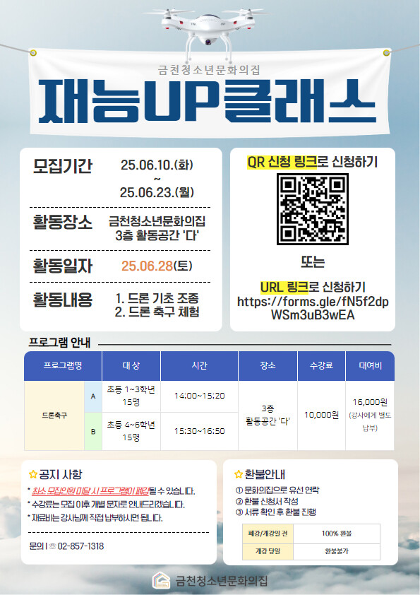 [시민일보 = 여영준 기자] 서울 금천구(구청장 유성훈)는 오는 28일 금천청소년문화의집에서 ‘재능UP클래스 드론체험 프로그램’을 운영한다고 밝혔다.