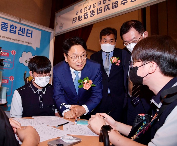 [광주=정찬남 기자] 강기정 광주광역시장이 12일 오후 서구 김대중컨벤션센터에서 열린 '광주권역 일학습병행 잡마켓' 행사에 참석해 취업지원 부스에서 고등학생들과 대화를 나누고 있다./광주광역시 제공