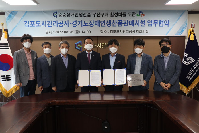 경기 김포도시관리공사는 최근 중증 장애인생산품 판매촉진과 장애인 고용확대 등을 위해 경기도장애인생산품판매시설과 업무협약을 체결했다. 양 기관은 상호 유기적인 교류와 업무협력을 약속했으며, 공사는 협약 체결 이후에도 우선구매제도 교육 등의 행사를 판매시설과 함께 열 예정이다. 사진은 협약식에서 관계자들이 기념촬영을 하는 모습. (사진제공=김포도시관리공사)