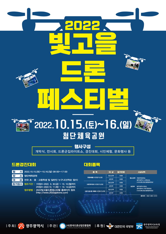경진대회는 드론헌팅배틀, 드론게이트, 드론 팝드론배틀 등 3개 프로그램이 일반부와 학생부로 나눠 32강부터 토너먼트로 진행된다. 우수한 성적을 거둔 참가자에게는 광주시장상, 국방부장관상 및 부상이 제공된다.