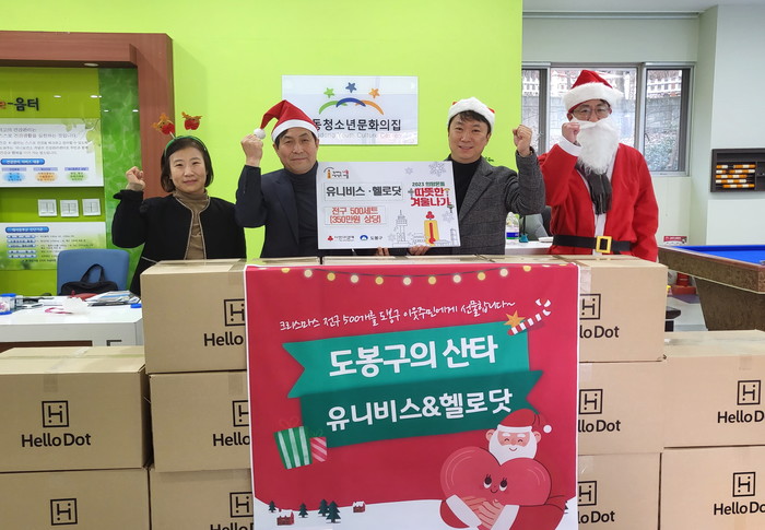 서울 도봉구 창3동은 지난 13일 지역내 위치한 기업 (주)유니비스와 헬로닷으로부터 크리스마스 전구 500세트(350만원 상당)를 지원받았다. 사진은 전달식에서 관계자들이 기념촬영을 하고 있는 모습. (사진제공=도봉구청)