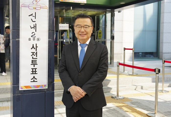 | ▲ 신내2동 사전투표소에서 투표에 참여한 류경기 구청장의 모습. (사진=중랑구청 제공) |