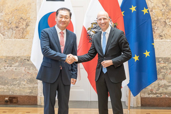 | ▲ 삼성전자 DX부문장 한종희 부회장(왼쪽)이 지난 8일(현지시간) 오스트리아 비엔나에서 마틴 코허 노동부 장관을 만나 경제협력과 지속가능한 미래에 대해 논의했다.(사진제공=오스트리아 정부) |