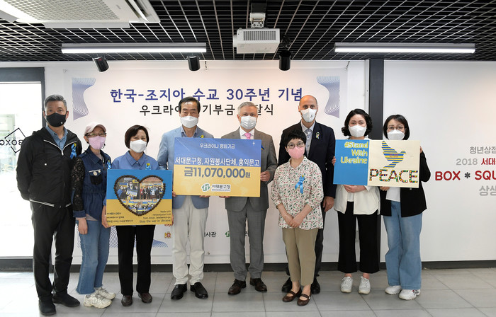 문석진 서대문구청장은 지난 7일 한국과 조지아의 우호 협력을 증진하고 우크라이나 전쟁 종식과 평화 회복을 기원하는 ‘한국-조지아 수교 30주년 기념행사’에 참석했다. 사진은 문 구청장(왼쪽 네 번째)이 지역내 자원봉사단체들 등이 기부한 1107만원의 구호 성금을 주한 우크라이나대사관에 전하고 있는 모습. (사진제공=서대문구청)